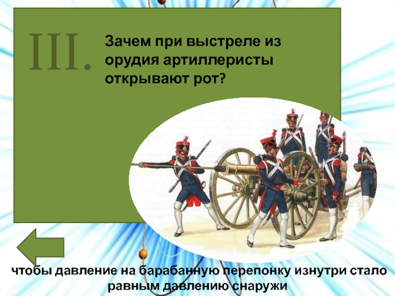 Слайд 46Зачем при выстреле из орудия артиллеристы открывают рот?