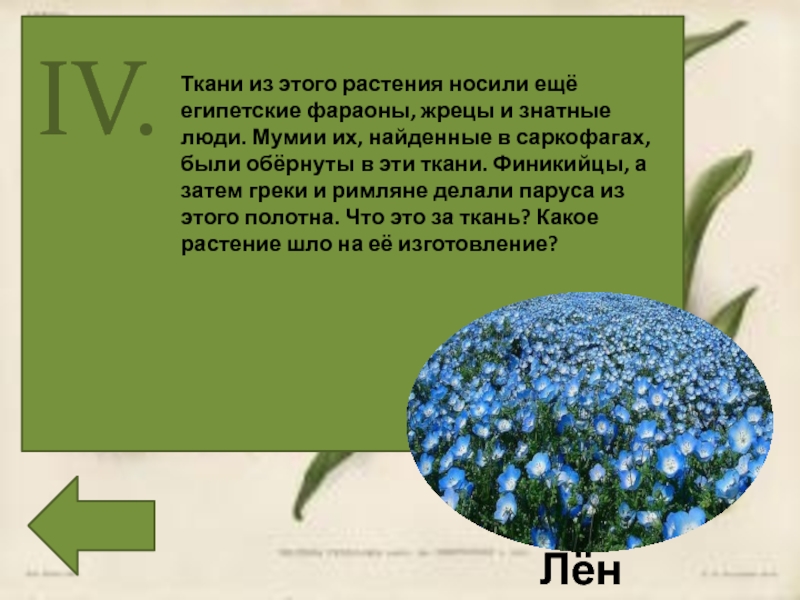 люди. Мумии их, найденные в саркофагах, были обёрнуты в эти ткани. Финикийцы, а затем греки и римляне делали паруса из этого полотна. Что это за ткань? Какое растение шло на её изготовление?