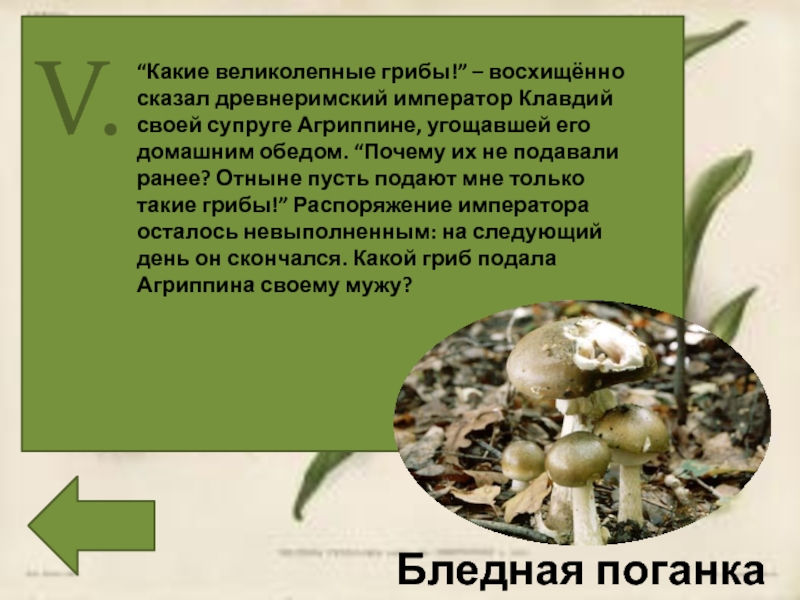 Агриппине, угощавшей его домашним обедом. “Почему их не подавали ранее? Отныне пусть подают мне только такие грибы!” Распоряжение императора осталось невыполненным: на следующий день он скончался. Какой гриб подала Агриппина своему мужу?