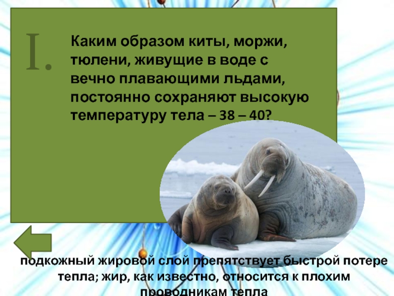 Слайд 44Каким образом киты, моржи, тюлени, живущие в воде с вечно плавающими