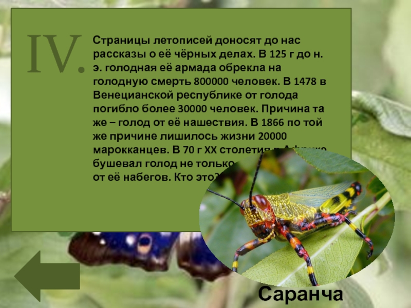 125 г до н.э. голодная её армада обрекла на голодную смерть 800000 человек. В 1478 в Венецианской республике от голода погибло более 30000 человек. Причина та же – голод от её нашествия. В 1866 по той же причине лишилось жизни 20000 марокканцев. В 70 г XX столетия в Африке бушевал голод не только от засухи, но и от её набегов. Кто это?