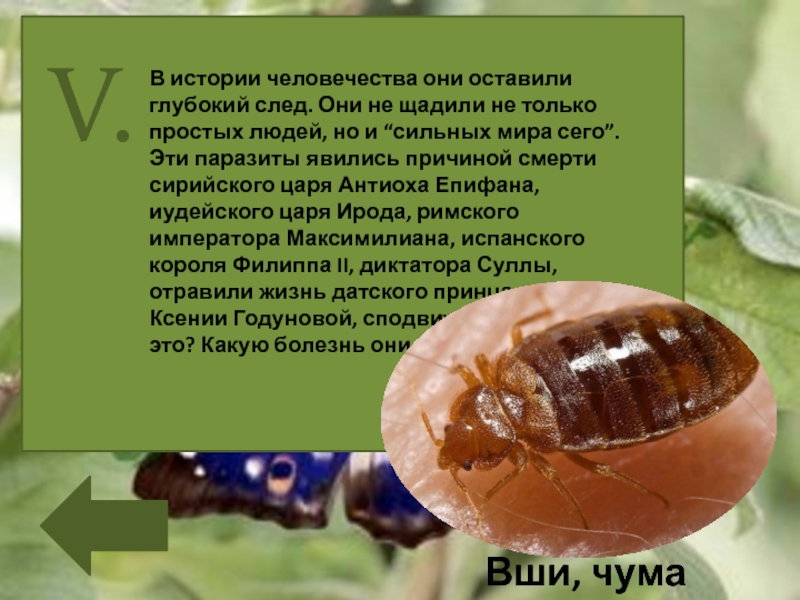 только простых людей, но и “сильных мира сего”. Эти паразиты явились причиной смерти сирийского царя Антиоха Епифана, иудейского царя Ирода, римского императора Максимилиана, испанского короля Филиппа II, диктатора Суллы, отравили жизнь датского принца – жениха Ксении Годуновой, сподвижника Петра I. Кто это? Какую болезнь они переносили?