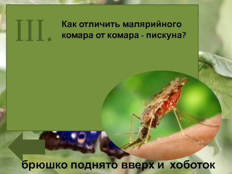 Слайд 36Как отличить малярийного комара от комара - пискуна?