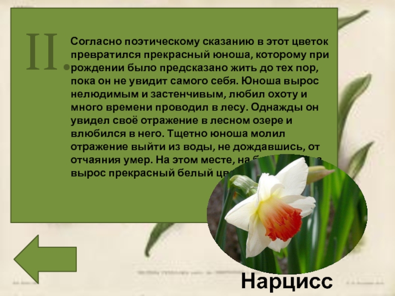 Слайд 30Согласно поэтическому сказанию в этот цветок превратился прекрасный юноша, которому при