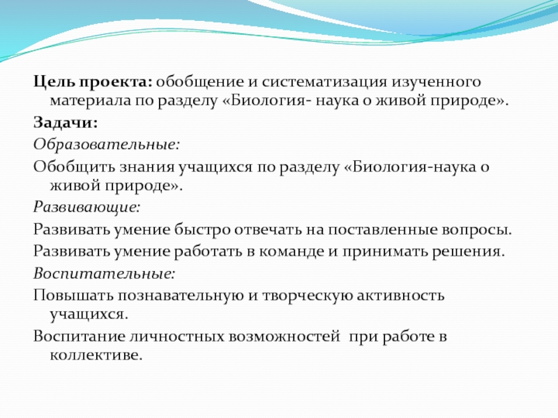 Цель проекта: обобщение и систематизация изученного материала по разделу «Биология- наука о живой природе».Задачи:Образовательные:Обобщить знания учащихся по разделу «Биология-наука о живой природе».Развивающие:Развивать умение быстро отвечать на поставленные вопросы.Развивать умение работать в команде и принимать решения.Воспитательные:Повышать познавательную и