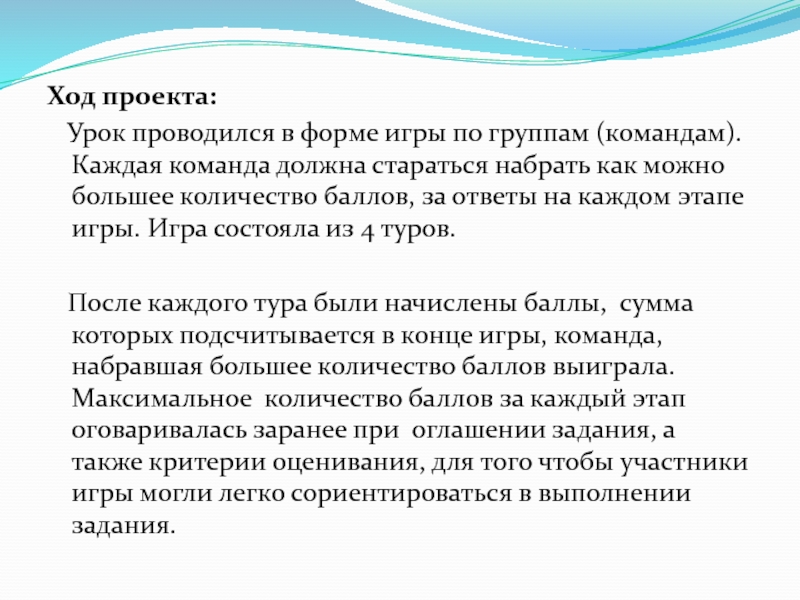 Ход проекта:  Урок проводился в форме игры по группам (командам). Каждая команда должна стараться набрать как