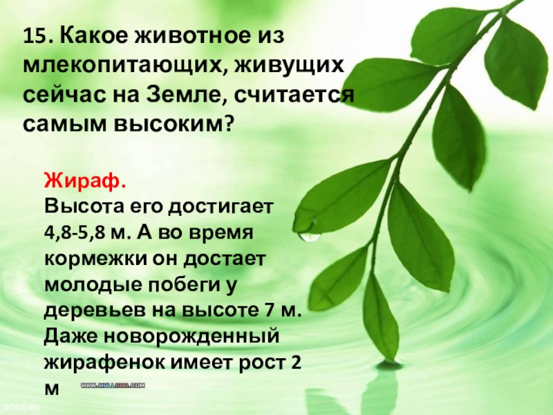 Высота его достигает 4,8-5,8 м. А во время кормежки он достает молодые побеги у деревьев на высоте 7 м.