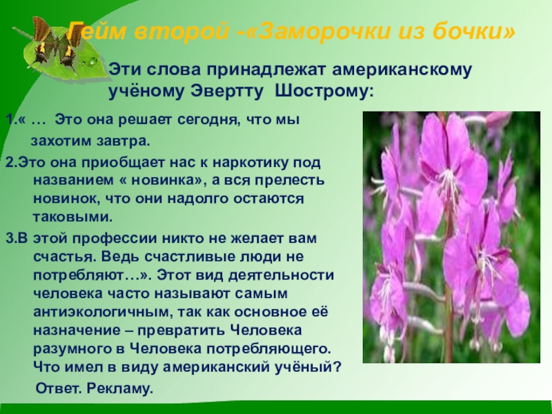 3.В этой профессии никто не желает вам счастья. Ведь счастливые люди не потребляют…». Этот вид деятельности человека часто называют самым антиэкологичным, так как основное её назначение – превратить Человека разумного в Человека потребляющего. Что имел в виду американский учёный?