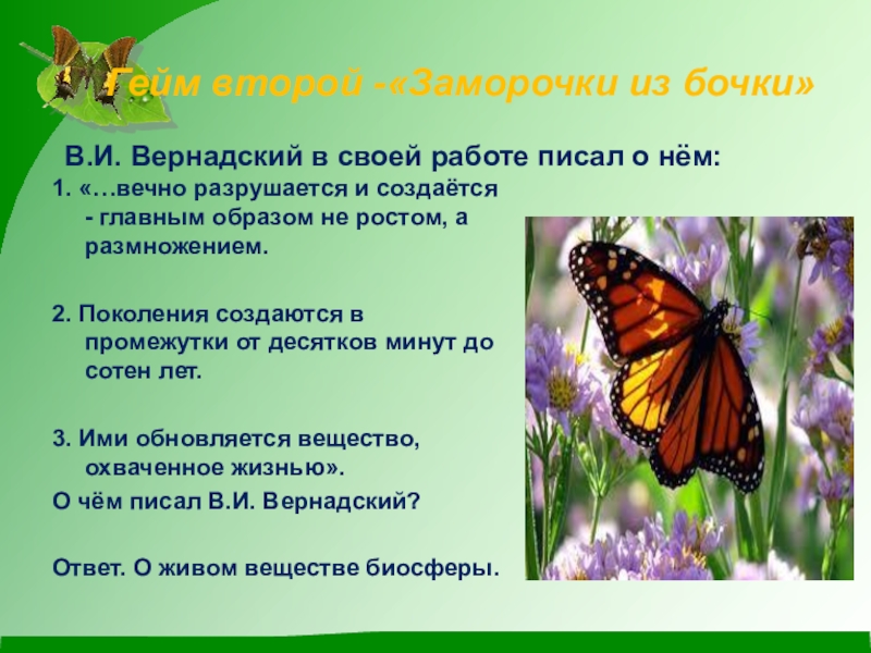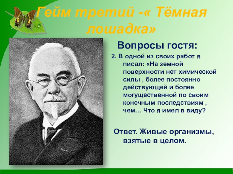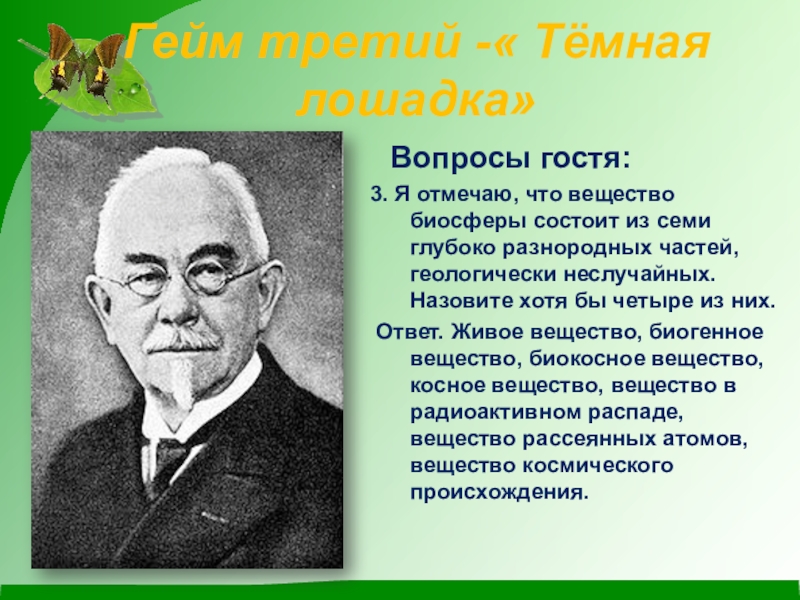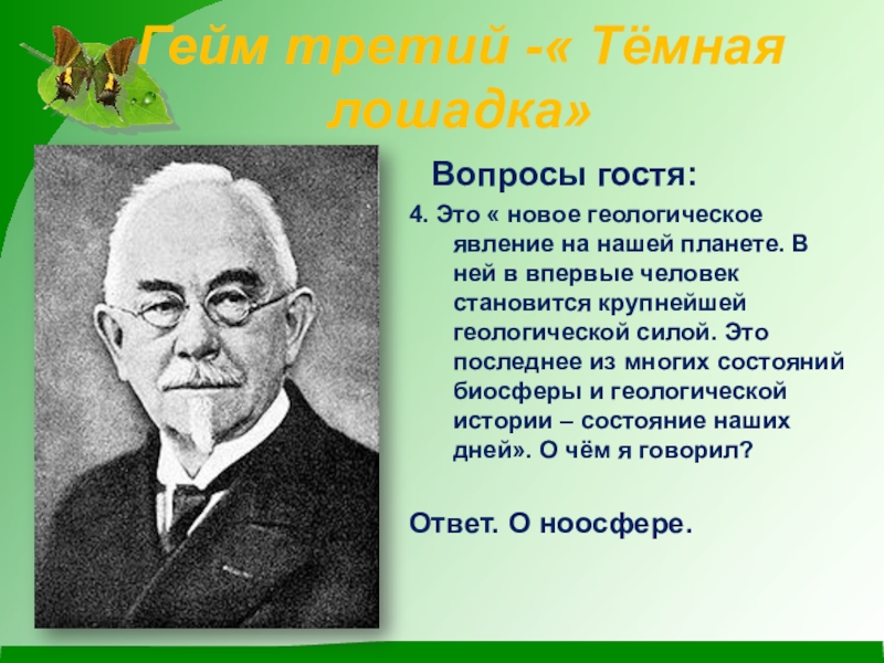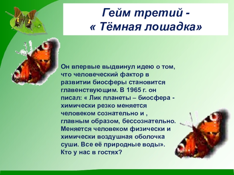 Он впервые выдвинул идею о том, что человеческий фактор в развитии биосферы становится главенствующим. В 1965 г. он писал: « Лик планеты – биосфера - химически резко меняется человеком сознательно и , главным образом, бессознательно. Меняется человеком физически и химически воздушная оболочка суши. Все её природные воды». Кто у нас в гостях?