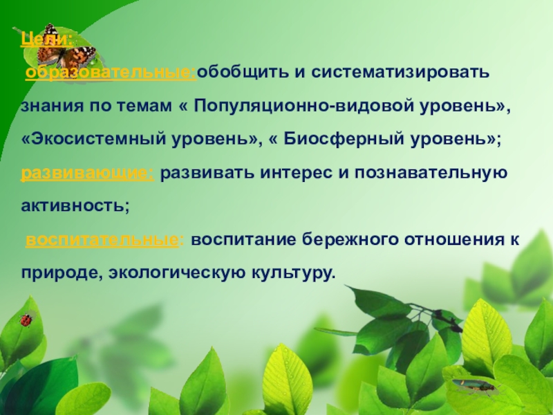 образовательные:обобщить и систематизировать знания по темам « Популяционно-видовой уровень», «Экосистемный