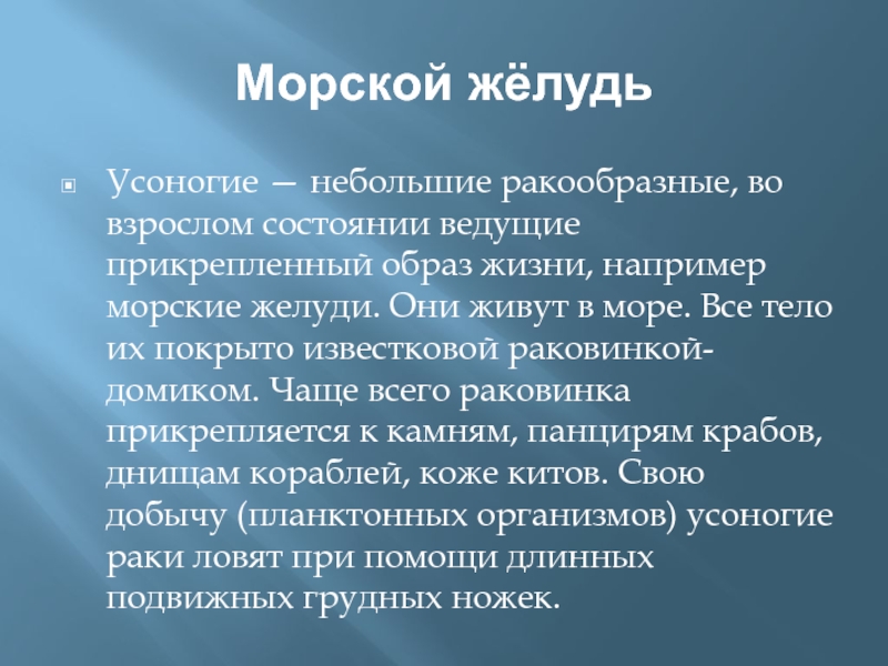 жизни, например морские желуди. Они живут в море. Все тело их покрыто известковой раковинкой-домиком. Чаще всего раковинка прикрепляется к камням, панцирям крабов, днищам кораблей, коже китов. Свою добычу (планктонных организмов) усоногие раки ловят при помощи длинных подвижных грудных ножек.