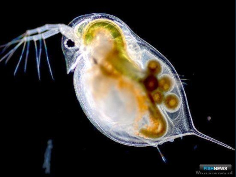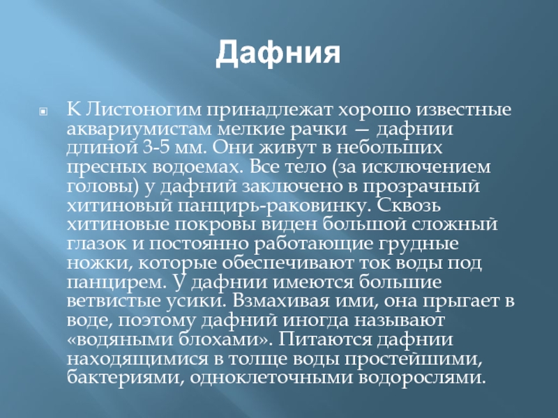 3-5 мм. Они живут в небольших пресных водоемах. Все тело (за исключением головы) у дафний заключено в прозрачный хитиновый панцирь-раковинку. Сквозь хитиновые покровы виден большой сложный глазок и постоянно работающие грудные ножки, которые обеспечивают ток воды под панцирем. У дафнии имеются большие ветвистые усики. Взмахивая ими, она прыгает в воде, поэтому дафний иногда называют «водяными блохами». Питаются дафнии находящимися в толще воды простейшими, бактериями, одноклеточными водорослями.