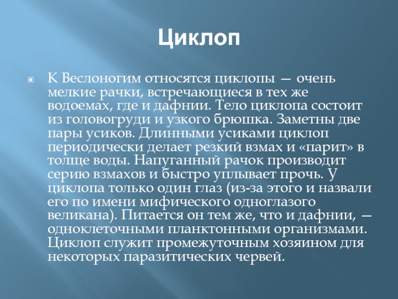же водоемах, где и дафнии. Тело циклопа состоит из головогруди и узкого брюшка. Заметны две пары усиков. Длинными усиками циклоп периодически делает резкий взмах и «парит» в толще воды. Напуганный рачок производит серию взмахов и быстро уплывает прочь. У циклопа только один глаз (из-за этого и назвали его по имени мифического одноглазого великана). Питается он тем же, что и дафнии, — одноклеточными планктонными организмами. Циклоп служит промежуточным хозяином для некоторых паразитических червей.