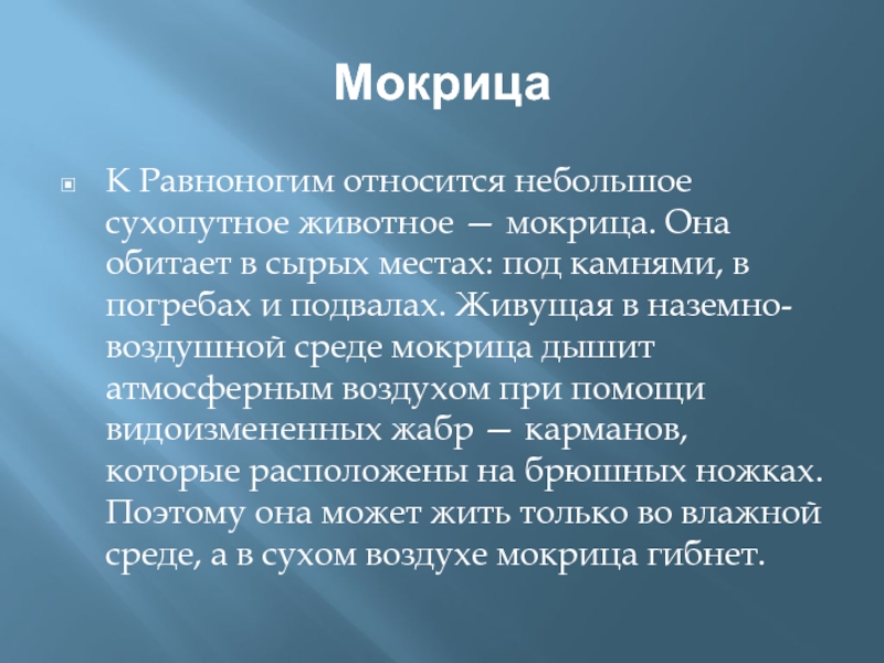 К Равноногим относится небольшое сухопутное животное — мокрица. Она обитает в