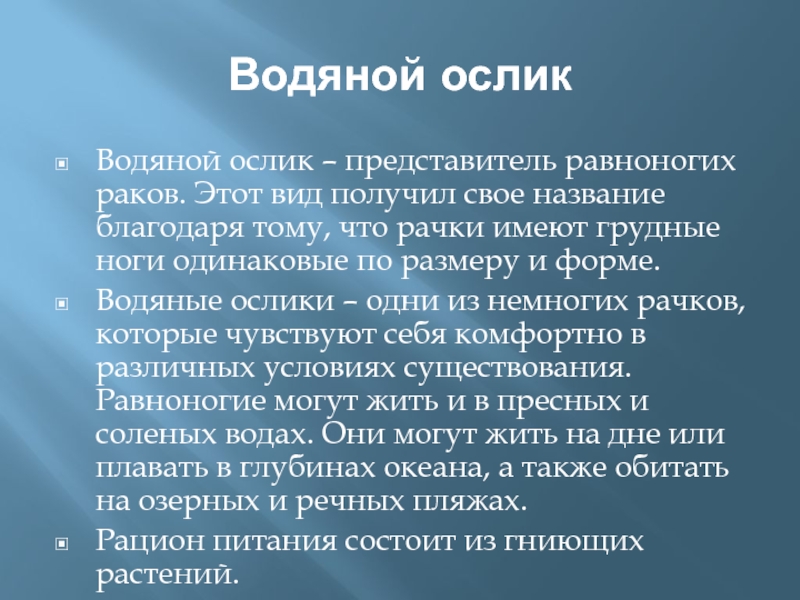 Водяной ослик – представитель равноногих раков. Этот вид получил свое
