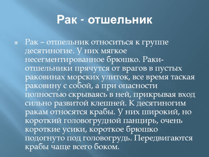 мягкое несегментированное брюшко. Раки-отшельники прячутся от врагов в пустых раковинах морских улиток, все время таская раковину с собой, а при опасности полностью скрываясь в ней, прикрывая вход сильно развитой клешней. К десятиногим ракам относятся крабы. У них широкий, но короткий головогрудной панцирь, очень короткие усики, короткое брюшко подогнуто под головогрудь. Передвигаются крабы чаще всего боком.