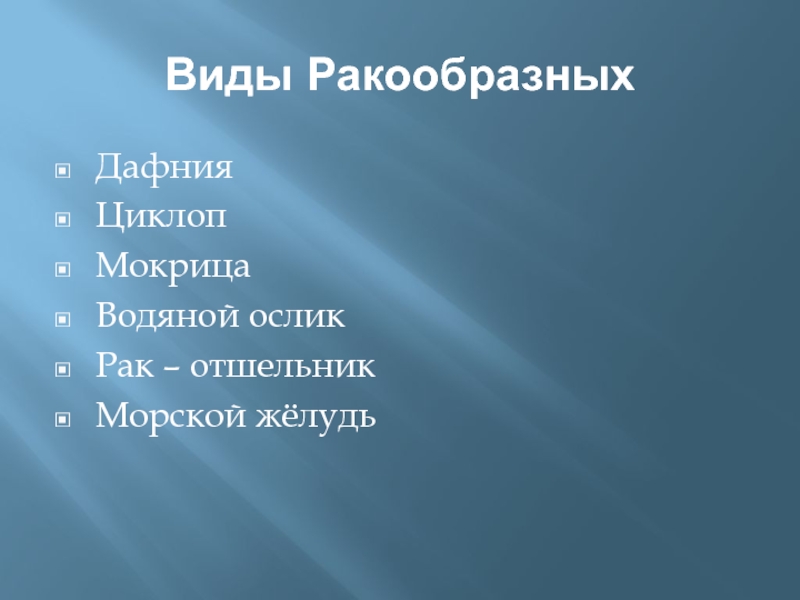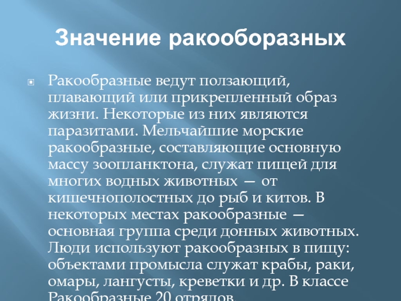 них являются паразитами. Мельчайшие морские ракообразные, составляющие основную массу зоопланктона, служат пищей для многих водных животных — от кишечнополостных до рыб и китов. В некоторых местах ракообразные — основная группа среди донных животных. Люди используют ракообразных в пищу: объектами промысла служат крабы, раки, омары, лангусты, креветки и др. В классе Ракообразные 20 отрядов.