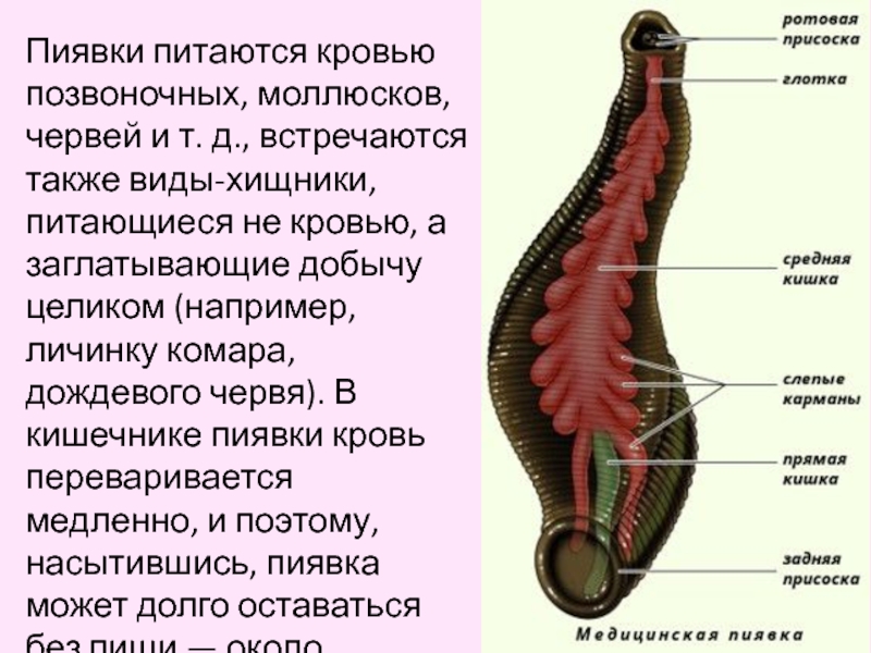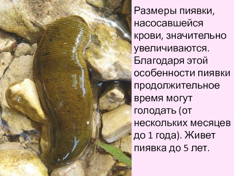 Слайд 6Размеры пиявки, насосавшейся крови, значительно увеличиваются. Благодаря этой особенности пиявки продолжительное