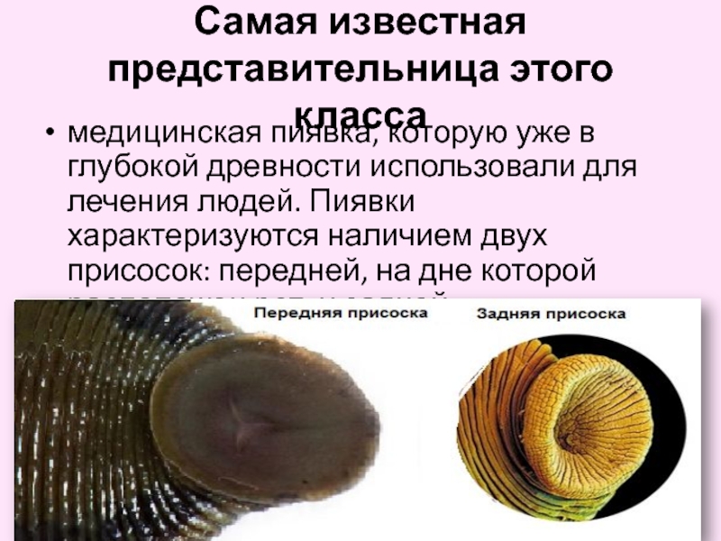 древности использовали для лечения людей. Пиявки характеризуются наличием двух присосок: передней, на дне которой расположен рот, и задней.
