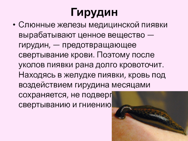 свертывание крови. Поэтому после уколов пиявки рана долго кровоточит. Находясь в желудке пиявки, кровь под воздействием гирудина месяцами сохраняется, не подвергаясь свертыванию и гниению.