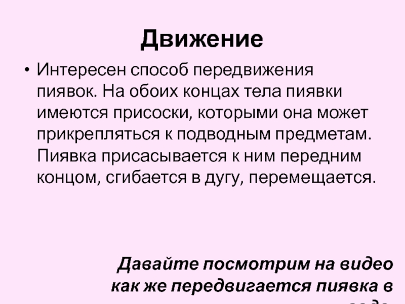 Интересен способ передвижения пиявок. На обоих концах тела пиявки имеются присоски,