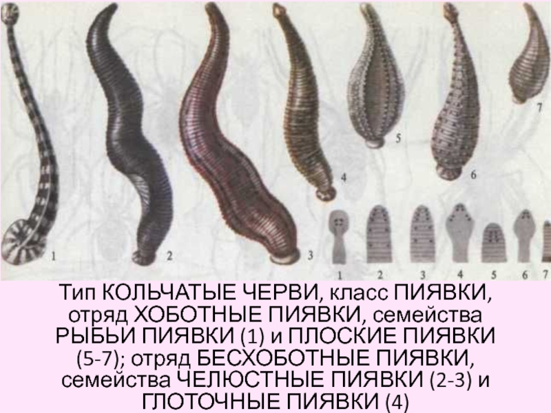(1) и ПЛОСКИЕ ПИЯВКИ (5-7); отряд БЕСХОБОТНЫЕ ПИЯВКИ, семейства ЧЕЛЮСТНЫЕ ПИЯВКИ (2-3) и ГЛОТОЧНЫЕ ПИЯВКИ (4)