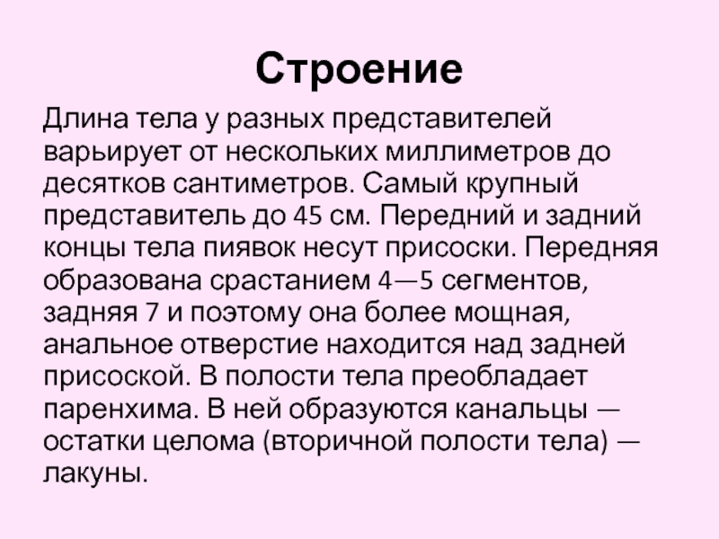 сантиметров. Самый крупный представитель до 45 см. Передний и задний концы тела пиявок несут присоски. Передняя образована срастанием 4—5 сегментов, задняя 7 и поэтому она более мощная, анальное отверстие находится над задней присоской. В полости тела преобладает паренхима. В ней образуются канальцы — остатки целома (вторичной полости тела) — лакуны.