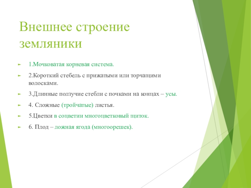 Внешнее строение земляники1.Мочковатая корневая система.2.Короткий стебель с прижатыми или торчащими волосками.3.Длинные ползучие стебли с почками на концах