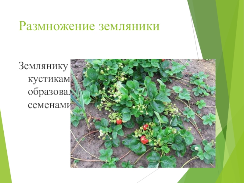 Размножение земляники Землянику садовую размножают кустиками, которые образовались на усах, или семенами.
