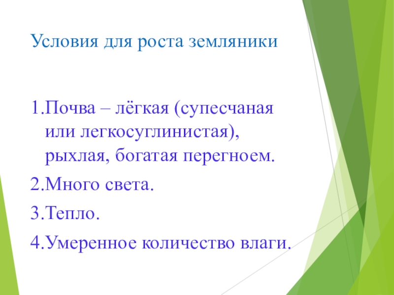 Условия для роста земляники1.Почва – лёгкая (супесчаная или легкосуглинистая), рыхлая, богатая перегноем.2.Много света.3.Тепло.4.Умеренное количество влаги.