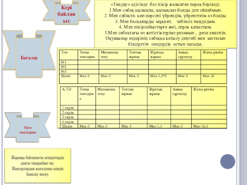 Кері байланысБағалау«Таңдау» әдісінде бес пікір жазылған парақ беріледі.1.Мен сабақ қызықты, қызықсыз болды деп ойлаймын.2. Мен сабақта: көп
