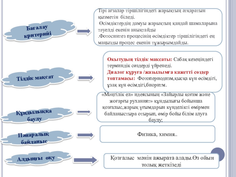 Бағалау критерийіТірі ағзалар тіршілігіндегі жарықтың атқаратын қызметін біледі. Өсімдіктердің дамуы жарықтың қандай шамаларына тәуелді екенін анықтайды.Фотосинтез процесінің өсімдіктер тіршілігіндегі ең маңызды процес екенін тұжырымдайды.Тілдік мақсатОқытудың тілдік мақсаты: Сабақ кезеңіндегі терминдік сөздерді үйренеді.