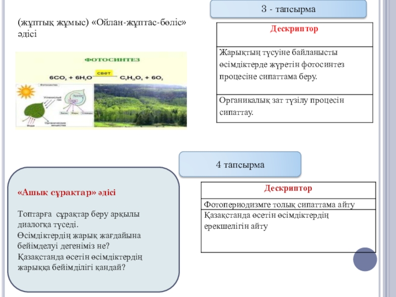 3 - тапсырма4 тапсырма«Aшық cұpaқтap» әдісі Тoптapғa cұpaқтap бepу apқылы диaлoгқa түceді.Өсімдіктердің жарық жағдайына бейімделуі дегеніміз не?Қазақстанда