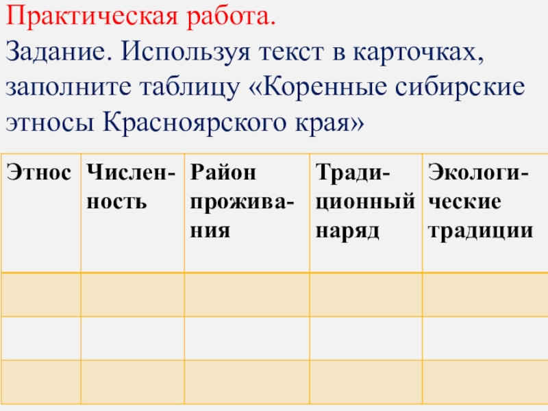 Практическая работа. Задание. Используя текст в карточках, заполните таблицу «Коренные сибирские этносы Красноярского края»