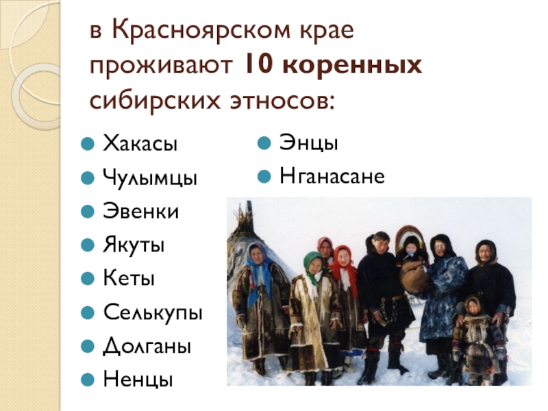 Слайд 7в Красноярском крае проживают 10 коренных сибирских этносов: