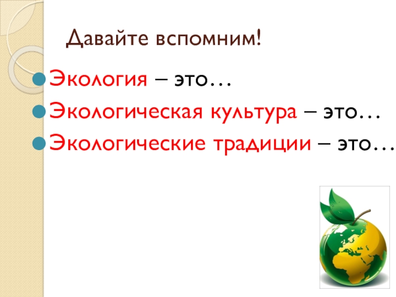 Давайте вспомним!Экология – это…Экологическая культура – это…Экологические традиции – это…