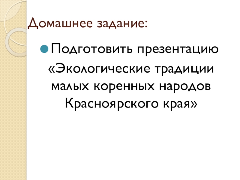 Домашнее задание:Подготовить презентацию «Экологические традиции малых коренных народов Красноярского края»