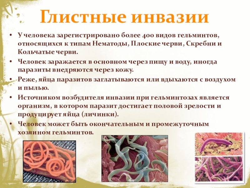 Глистные инвазииУ человека зарегистрировано более 400 видов гельминтов, относящихся к типам Нематоды, Плоские черви, Скребни и Кольчатые