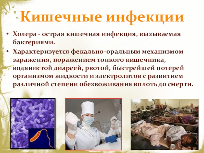 Кишечные инфекцииХолера - острая кишечная инфекция, вызываемая бактериями.Характеризуется фекально-оральным механизмом заражения, поражением тонкого кишечника, водянистой диареей, рвотой,