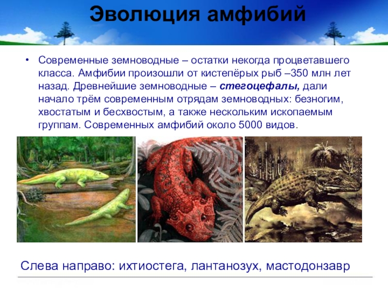Слева направо: ихтиостега, лантанозух, мастодонзавр