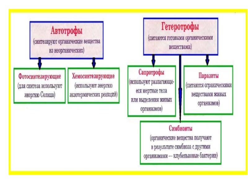 готовых органических веществ: сапрофиты, симбионты, паразиты)
