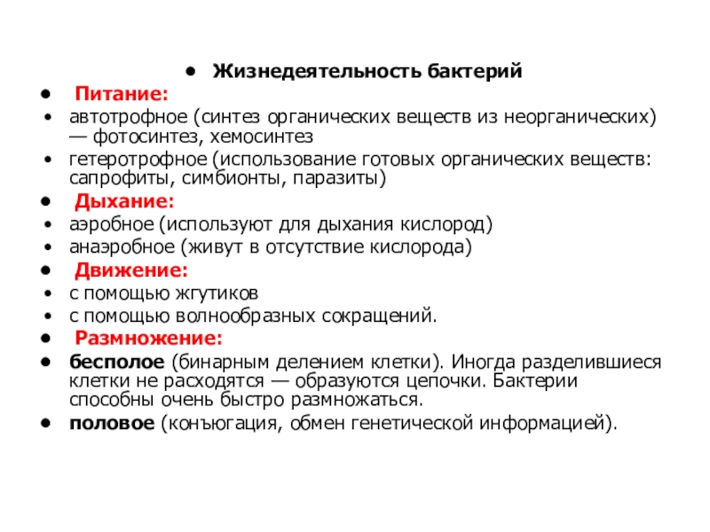 Жизнедеятельность бактерий Питание:автотрофное (синтез органических веществ из неорганических) — фотосинтез, хемосинтезгетеротрофное (использование готовых органических веществ: сапрофиты, симбионты, паразиты) Дыхание:аэробное