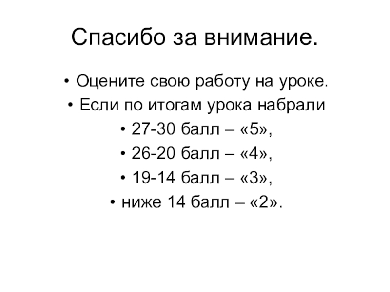 Спасибо за внимание.Оцените свою работу на уроке. Если по итогам урока набрали 27-30 балл – «5», 26-20