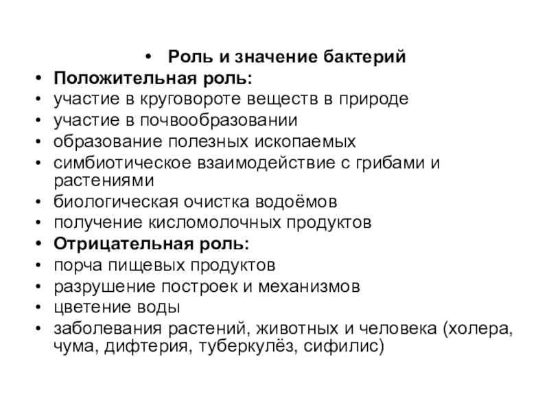 Роль и значение бактерийПоложительная роль:участие в круговороте веществ в природеучастие в почвообразованииобразование полезных ископаемыхсимбиотическое взаимодействие с грибами