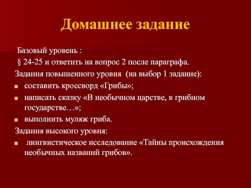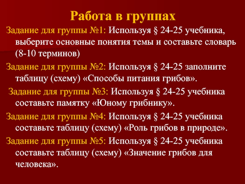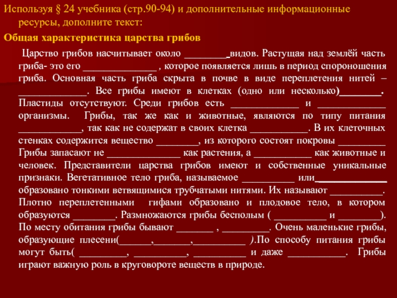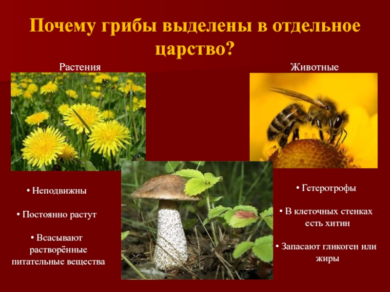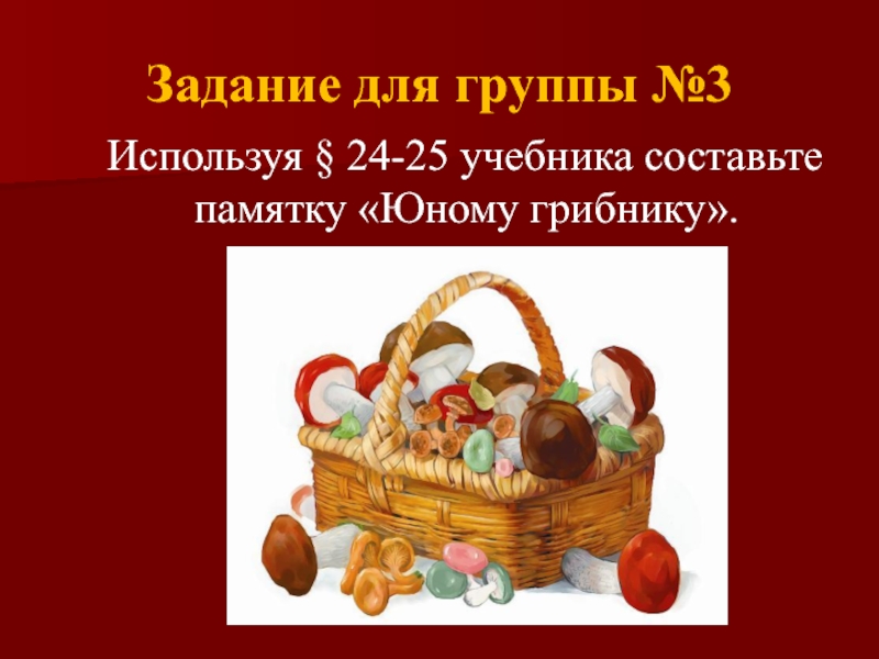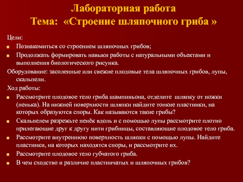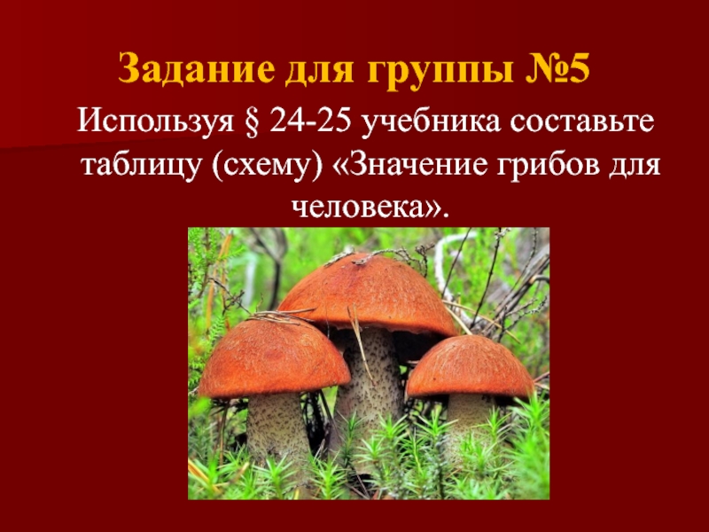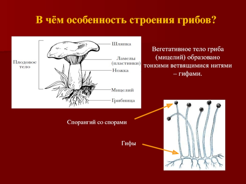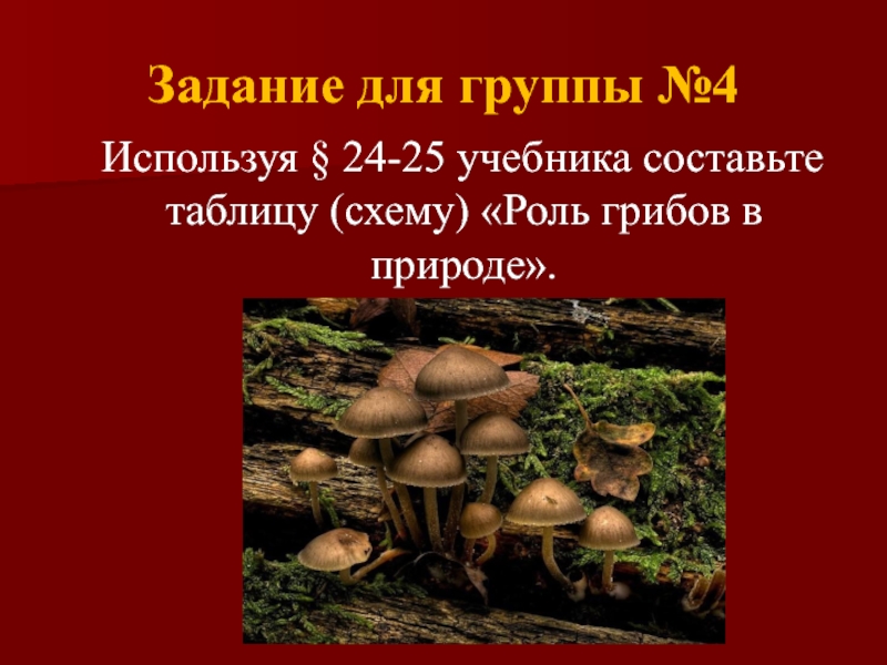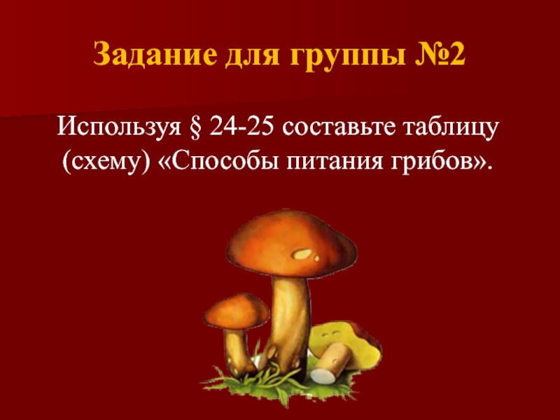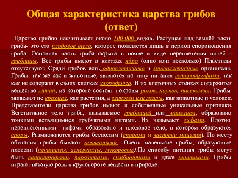 а) питаются органическими веществами умерших организмов, б) содержат хлоропласты, в) не имеют мицелия, 4) имеют плодовое тело.
