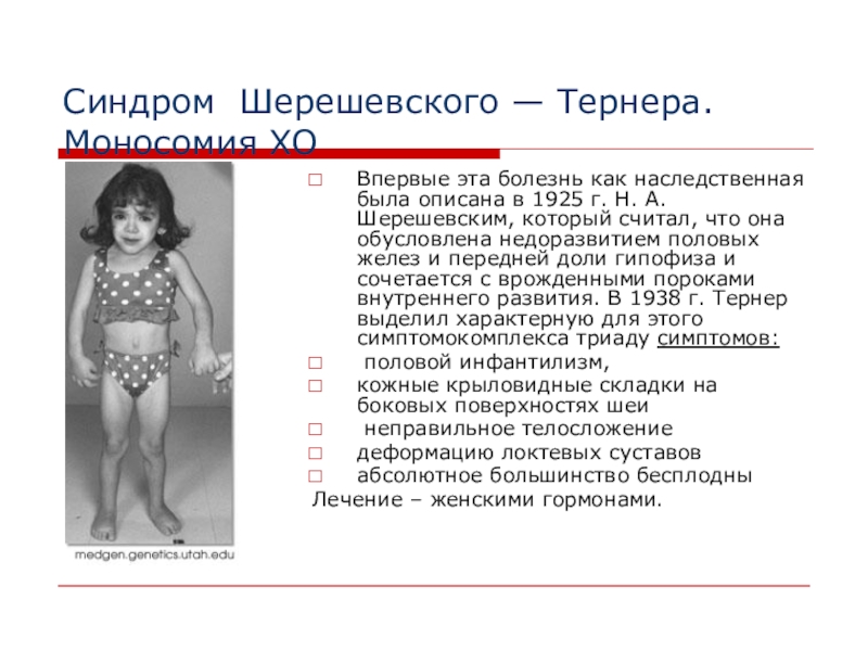в 1925 г. Н. А. Шерешевским, который считал, что она обусловлена недоразвитием половых желез и передней доли гипофиза и сочетается с врожденными пороками внутреннего развития. В 1938 г. Тернер выделил характерную для этого симптомокомплекса триаду симптомов: