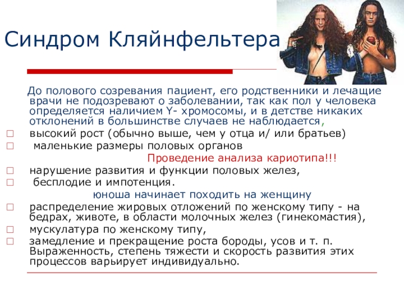 Это мужчины с феминоподобной внешностью, высокого роста, половые органы недоразвиты (в связи с пониженным синтезом андрогенов), бесплодные, умственное развитие немного ниже нормы.