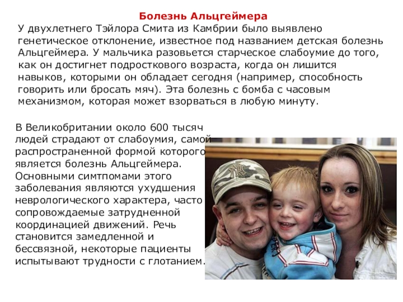 известное под названием детская болезнь Альцгеймера. У мальчика разовьется старческое слабоумие до того, как он достигнет подросткового возраста, когда он лишится навыков, которыми он обладает сегодня (например, способность говорить или бросать мяч). Эта болезнь с бомба с часовым механизмом, которая может взорваться в любую минуту.