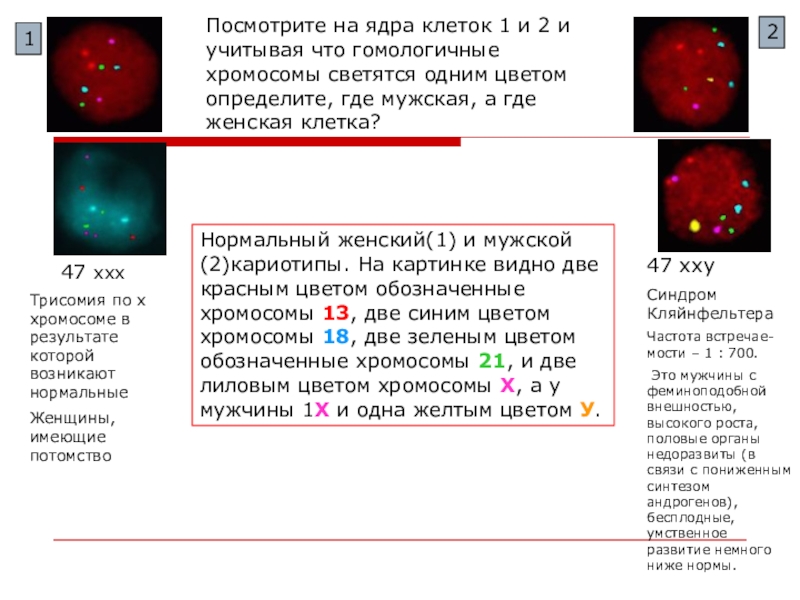 Слайд 6Нормальный женский(1) и мужской (2)кариотипы. На картинке видно две красным цветом