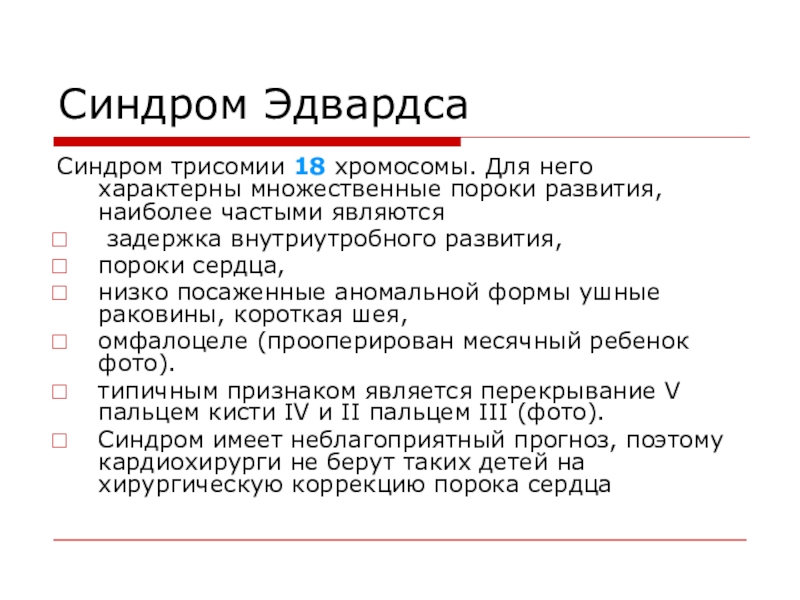 Синдром трисомии 18 хромосомы. Для него характерны множественные пороки